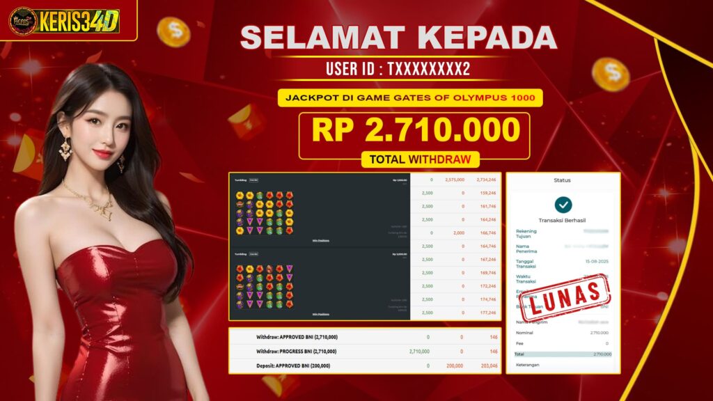 Setiap hari, member KERIS34D berhasil meraih jackpot besar dari berbagai provider slot ternama yang kami sediakan, seperti Pragmatic Play, Habanero, PG Soft, dan masih banyak lagi. Kami secara rutin menampilkan bukti screenshot atau rekapan kemenangan yang berhasil diraih, mulai dari kemenangan ratusan ribu hingga puluhan juta rupiah. Semua slip kemenangan ini kami hadirkan untuk membuktikan bahwa di KERIS34D, peluang menang itu nyata