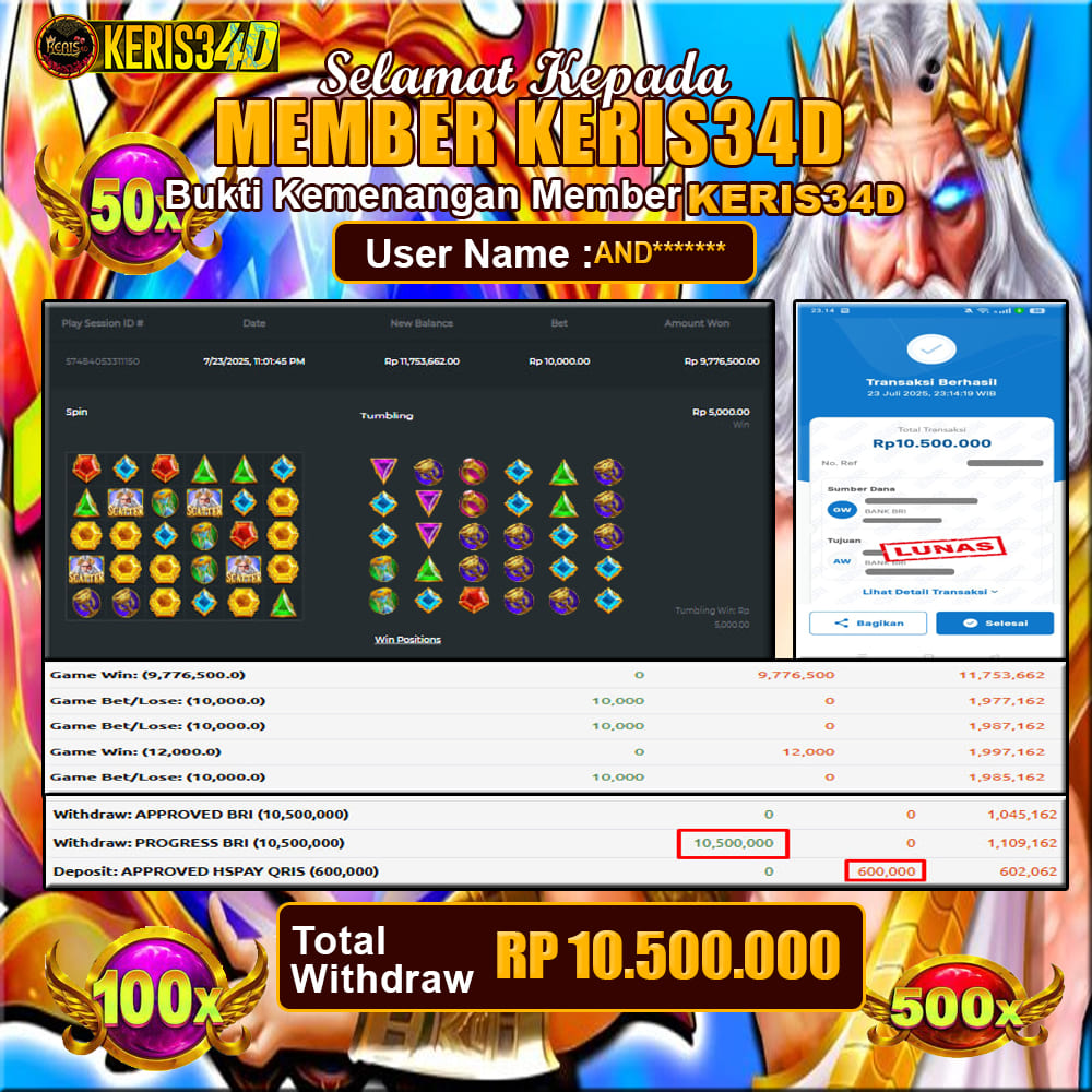 Setiap hari, member KERIS34D berhasil meraih jackpot besar dari berbagai provider slot ternama yang kami sediakan, seperti Pragmatic Play, Habanero, PG Soft, dan masih banyak lagi. Kami secara rutin menampilkan bukti screenshot atau rekapan kemenangan yang berhasil diraih, mulai dari kemenangan ratusan ribu hingga puluhan juta rupiah. Semua slip kemenangan ini kami hadirkan untuk membuktikan bahwa di KERIS34D, peluang menang itu nyata