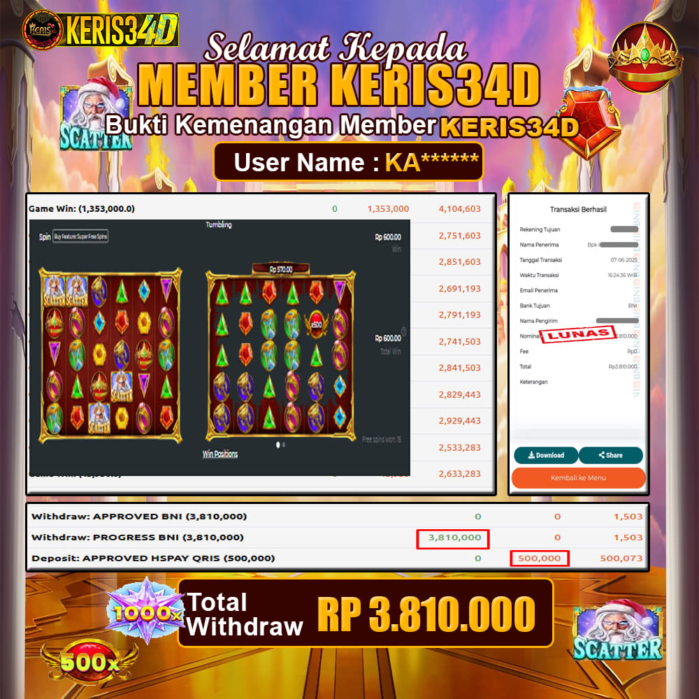 SSetiap hari, member KERIS34D berhasil meraih jackpot besar dari berbagai provider slot ternama yang kami sediakan, seperti Pragmatic Play, Habanero, PG Soft, dan masih banyak lagi. Kami secara rutin menampilkan bukti screenshot atau rekapan kemenangan yang berhasil diraih, mulai dari kemenangan ratusan ribu hingga puluhan juta rupiah. Semua slip kemenangan ini kami hadirkan untuk membuktikan bahwa di KERIS34D peluang menang itu nyata