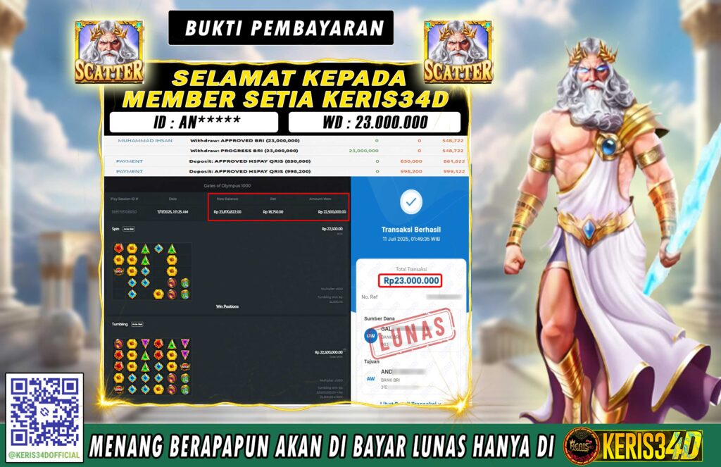 Setiap hari, member KERIS34D berhasil meraih jackpot besar dari berbagai provider slot ternama yang kami sediakan, seperti Pragmatic Play, Habanero, PG Soft, dan masih banyak lagi. Kami secara rutin menampilkan bukti screenshot atau rekapan kemenangan yang berhasil diraih, mulai dari kemenangan ratusan ribu hingga puluhan juta rupiah. Semua slip kemenangan ini kami hadirkan untuk membuktikan bahwa di KERIS34D peluang menang itu nyata