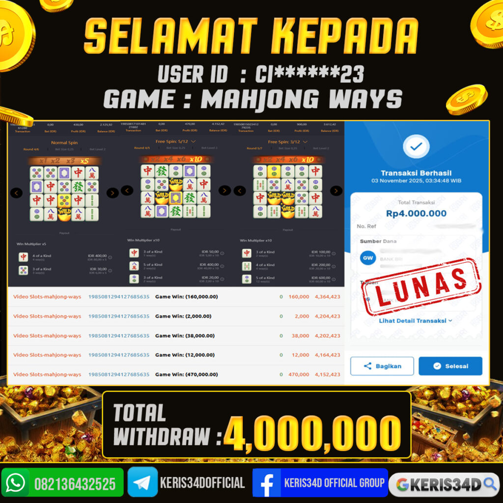 JACKPOT SLOT GACOR MAIN MAHJONG WAYS 03 NOVEMBER 2025, Jackpot Slot Gacor, Kemenangan Slot, Bukti Kemenangan Slot, Kemenangan PGSOFT, Menang Slot online, Slot Gacor, Situs Aman Terpercaya, WD Berapapun Pasti DI Bayar Tuntas, Maxwin Slot Online.