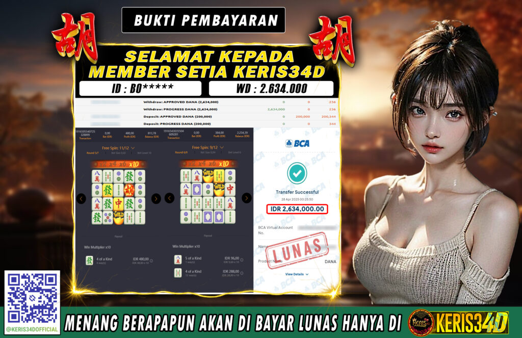 Setiap hari, member KERIS34D berhasil meraih jackpot besar dari berbagai provider slot ternama yang kami sediakan, seperti Pragmatic Play, Habanero, PG Soft, dan masih banyak lagi. Kami secara rutin menampilkan bukti screenshot atau rekapan kemenangan yang berhasil diraih, mulai dari kemenangan ratusan ribu hingga puluhan juta rupiah. Semua slip kemenangan ini kami hadirkan untuk membuktikan bahwa di KERIS34D, peluang menang itu nyata