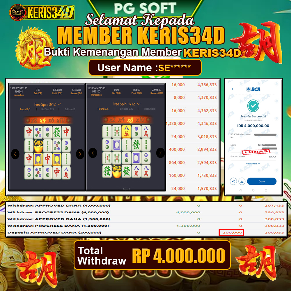 Setiap hari, member KERIS34D berhasil meraih jackpot besar dari berbagai provider slot ternama yang kami sediakan, seperti Pragmatic Play, Habanero, PG Soft, dan masih banyak lagi. Kami secara rutin menampilkan bukti screenshot atau rekapan kemenangan yang berhasil diraih, mulai dari kemenangan ratusan ribu hingga puluhan juta rupiah. Semua slip kemenangan ini kami hadirkan untuk membuktikan bahwa di KERIS34D, peluang menang itu nyata