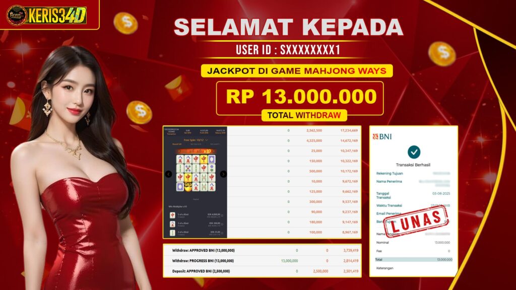 Setiap hari, member KERIS34D berhasil meraih jackpot besar dari berbagai provider slot ternama yang kami sediakan, seperti Pragmatic Play, Habanero, PG Soft, dan masih banyak lagi. Kami secara rutin menampilkan bukti screenshot atau rekapan kemenangan yang berhasil diraih, mulai dari kemenangan ratusan ribu hingga puluhan juta rupiah. Semua slip kemenangan ini kami hadirkan untuk membuktikan bahwa di KERIS34D, peluang menang itu nyata