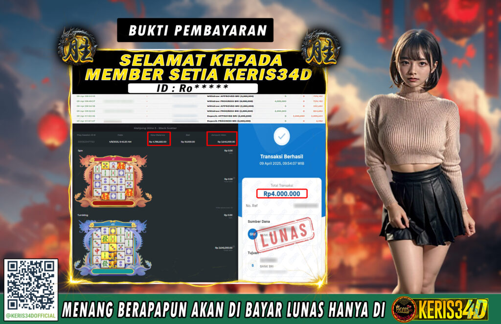 KERIS34D dikenal sebagai situs terpercaya yang selalu menghadirkan pengalaman bermain slot online yang aman, fair, dan berlisensi resmi. Di sini, kami tidak hanya sekadar memberikan janji, tapi bukti nyata berupa slip kemenangan yang dapat Anda lihat secara langsung.