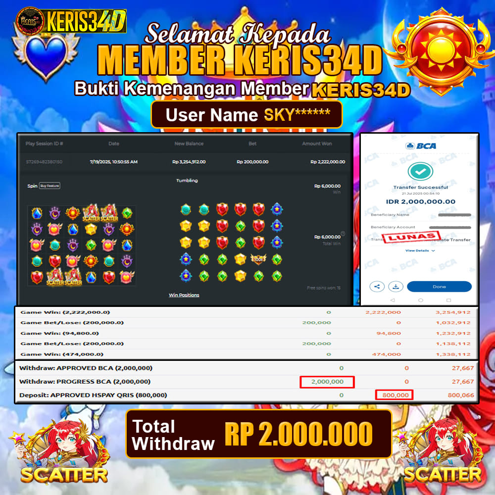 Setiap hari, member KERIS34D berhasil meraih jackpot besar dari berbagai provider slot ternama yang kami sediakan, seperti Pragmatic Play, Habanero, PG Soft, dan masih banyak lagi. Kami secara rutin menampilkan bukti screenshot atau rekapan kemenangan yang berhasil diraih, mulai dari kemenangan ratusan ribu hingga puluhan juta rupiah. Semua slip kemenangan ini kami hadirkan untuk membuktikan bahwa di KERIS34D, peluang menang itu nyata