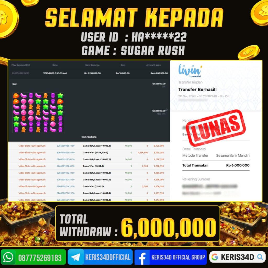 Setiap hari, member KERIS34D berhasil meraih jackpot besar dari berbagai provider slot ternama yang kami sediakan, seperti Pragmatic Play, Habanero, PG Soft, dan masih banyak lagi. Kami secara rutin menampilkan bukti screenshot atau rekapan kemenangan yang berhasil diraih, mulai dari kemenangan ratusan ribu hingga puluhan juta rupiah. Semua slip kemenangan ini kami hadirkan untuk membuktikan bahwa di KERIS34D, peluang menang itu nyata